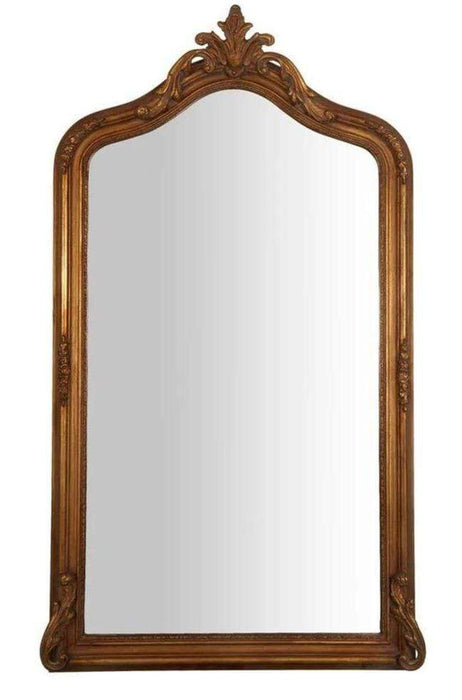 A glamorous full length wall mirror with a beautiful curved arched top. It has a crown with ornate design, for a grand look. The gold colour finish is made distressed with dark accents on the design to look Vintage.