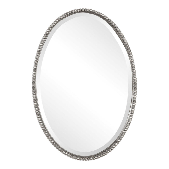 The Uttermost Sherise Oval Wall Mirror emanates beauty, elegance, and class all at the same time. Silver beads line up its nickel-finished frame, which is crafted using hand-forged metal. This gorgeous piece uses a bevelled centre mirror to accentuate the silver bead adorning its frame.