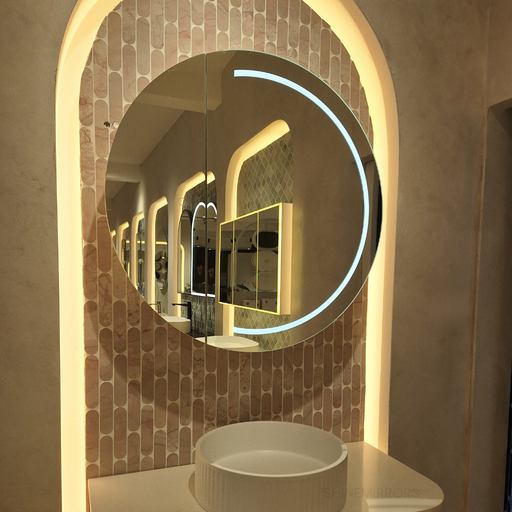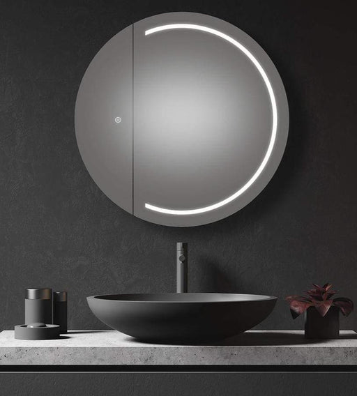 View full detailsAn LED Round Frontlit wall mirror cabinet for the powder room. Its LED Strip was designed as half-moon for a more modern feel. The cabinet door was...