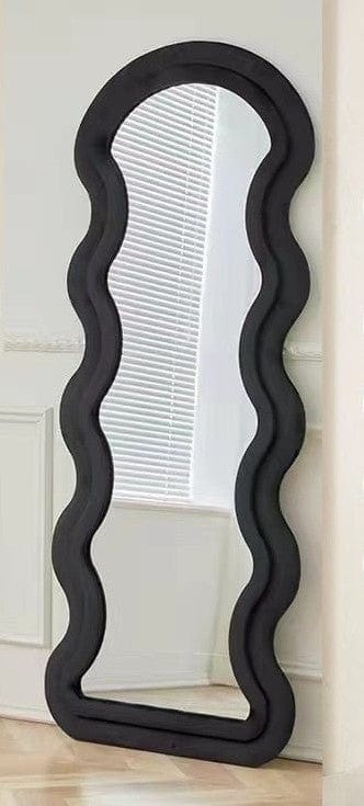 View full detailsExperience the allure of the Madilyn Black Full Size Wavy Wall Mirror. Its unique, asymmetrical structure is encased in a plush flannel-wrapped woo...
