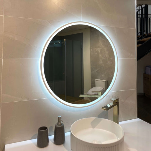 A modern styled frameless bathroom wall mirror with LED lighting radiating from behind the rounded shaped wall mirror. Its backlit dramatic effect ...
