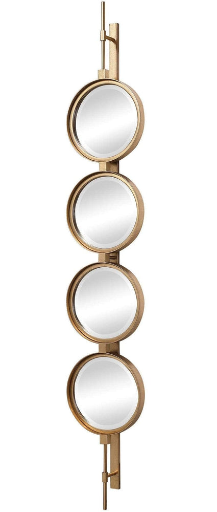 An elegant gold round wall mirror featuring beautiful circles of varying sizes to serve as a frame. The iron frame is finished with gold colour wit...