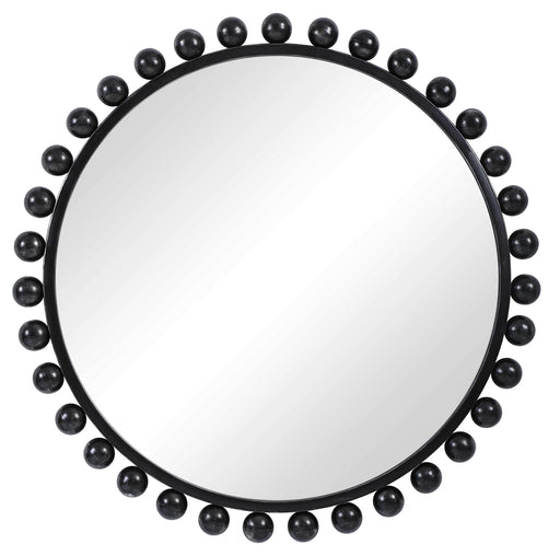 Adding accessories that are of unique design and refine texture are perfect for staging an interior. Uttermost Cyra Black Round Wall Mirror feature...