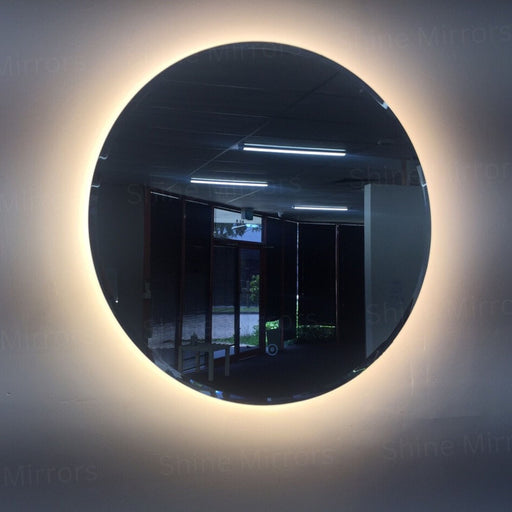 A modern styled frameless bathroom wall mirror with LED lighting radiating from behind the rounded shaped wall mirror. Its backlit dramatic effect ...