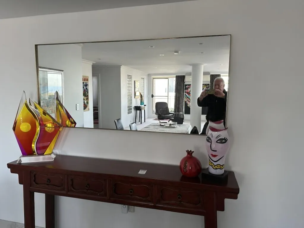 The mirrors were installed last week, but the bathrooms are not complete (waiting on shower screens, etc) and the mirrors still have the film on. In the meantime, here’s a photo of the installed ensuite mirror.