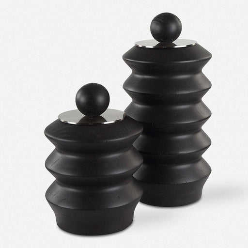 View full detailsAdd a touch of elegance to any table or countertop with these sleek black stained wood containers, featuring lift-off lids in brushed nickel. Avai...