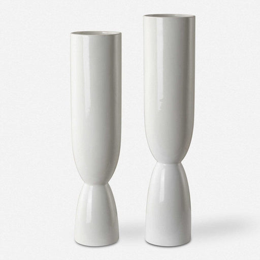 View full detailsComplete your home decor with the Uttermost Fusion Vases Set of 2. These elegant pieces are crafted entirely from glass and feature a unique swirle...