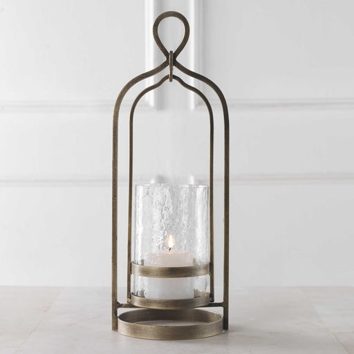 View full detailsThis expertly-crafted iron and glass candle lantern is the perfect addition to any space, providing a soft and inviting glow. With a removable text...