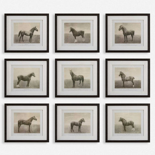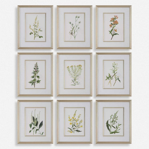 View full detailsThis set of nine framed botanical prints adds natural beauty to any room. Each print is on cream mats with a gold gallery frame, and protected by g...