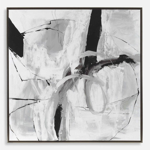 View full detailsHeat of the Moment is a striking abstract painting featuring dynamic black and burnt sienna strokes set against a backdrop of muted grays. Encased ...