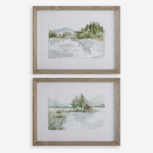 View full detailsThis framed print shows a calm waterscape in soft green and blue. It has a gray washed frame with a gold liner and white linen mat, adding a peacef...