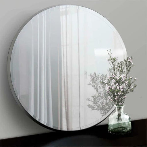 View full detailsElegant round mirror that comes with a bevel edge. The side frame is finished in matt silver tapered frame that is set back behind the mirror, for ...