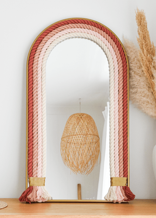 Nautical round wall mirror with a burnt orange colour accent. Jute and cotton ropes are twisted together to form its frame.  Natural lighting, bri...