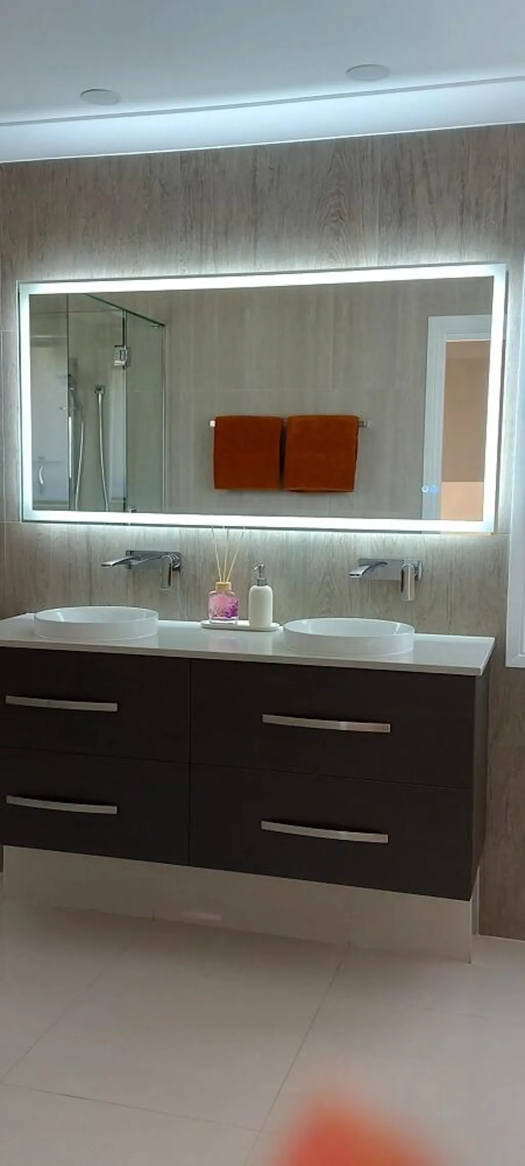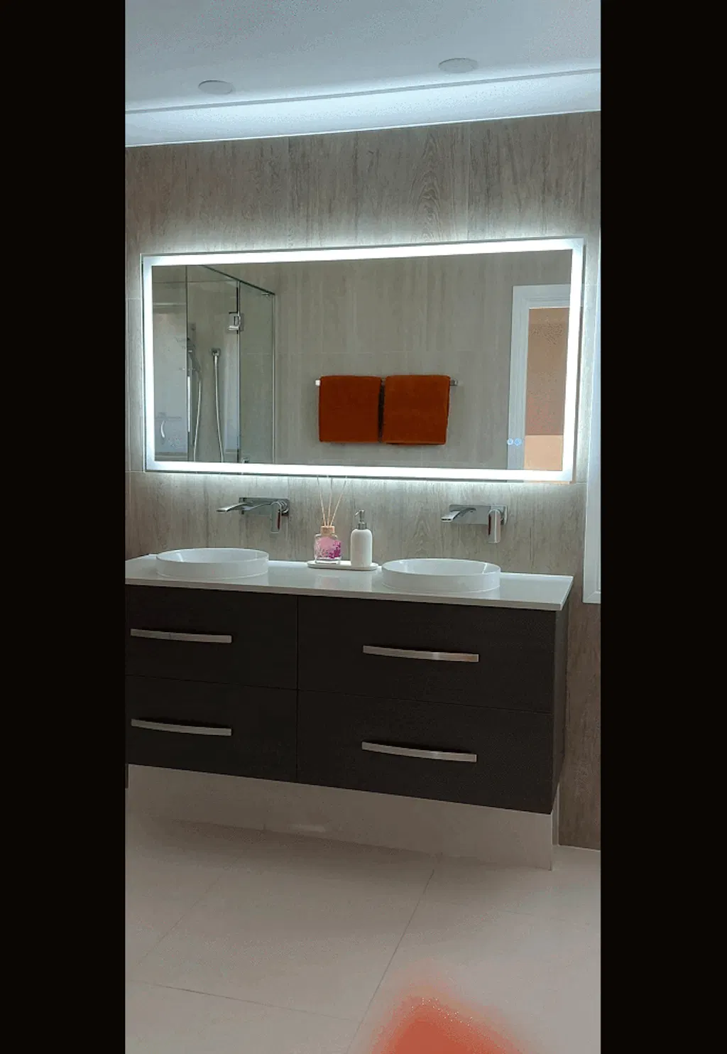 The mirrors were installed last week, but the bathrooms are not complete (waiting on shower screens, etc) and the mirrors still have the film on. In the meantime, here’s a photo of the installed ensuite mirror.