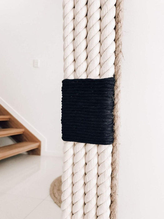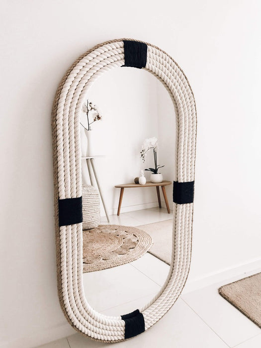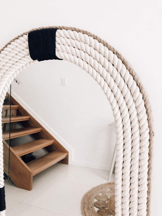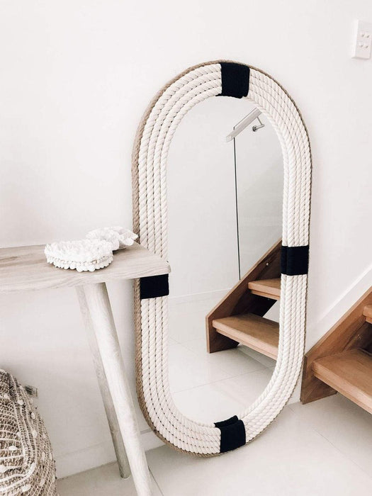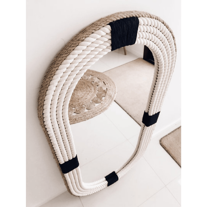 Adriel Navy Wall Mirror is a gorgeous handmade mirror made up of nice off white cotton rope with navy trim accent. Every detail is a clear vision of nautical inspired decor, making this show piece perfect for your coastal-themed home. For your special space, make use of essential ornaments, pull it off to the edge, don't be shy with the accents. With its shape, this can be hung either horizontally or vertically, and let it turn heads.