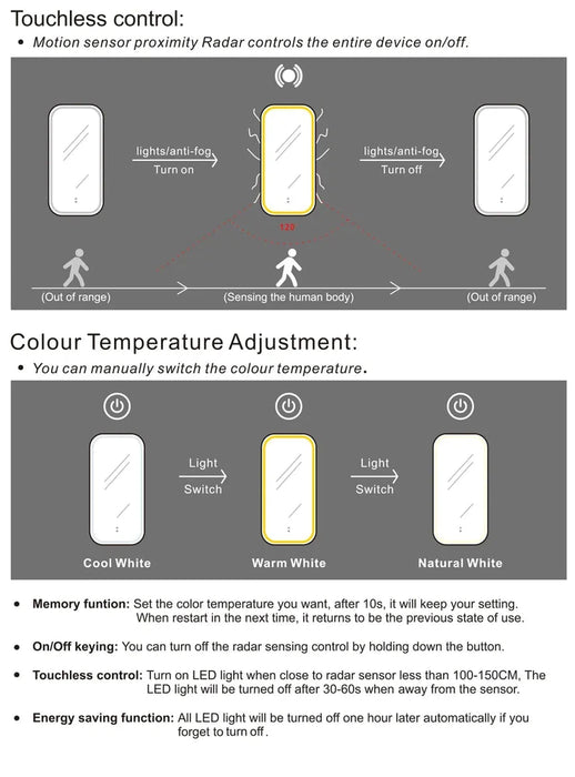 - Touch control sensor on/off light mirror; also has motion sensor LED light on/off