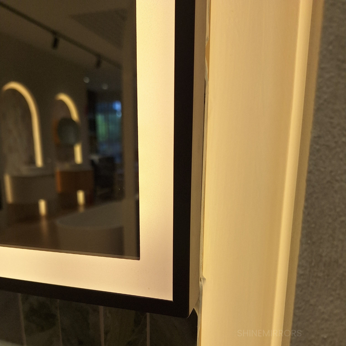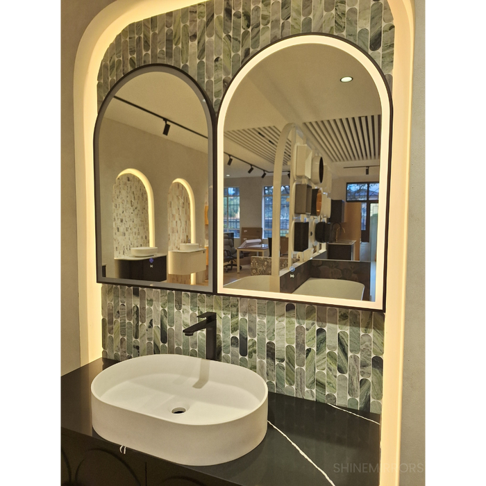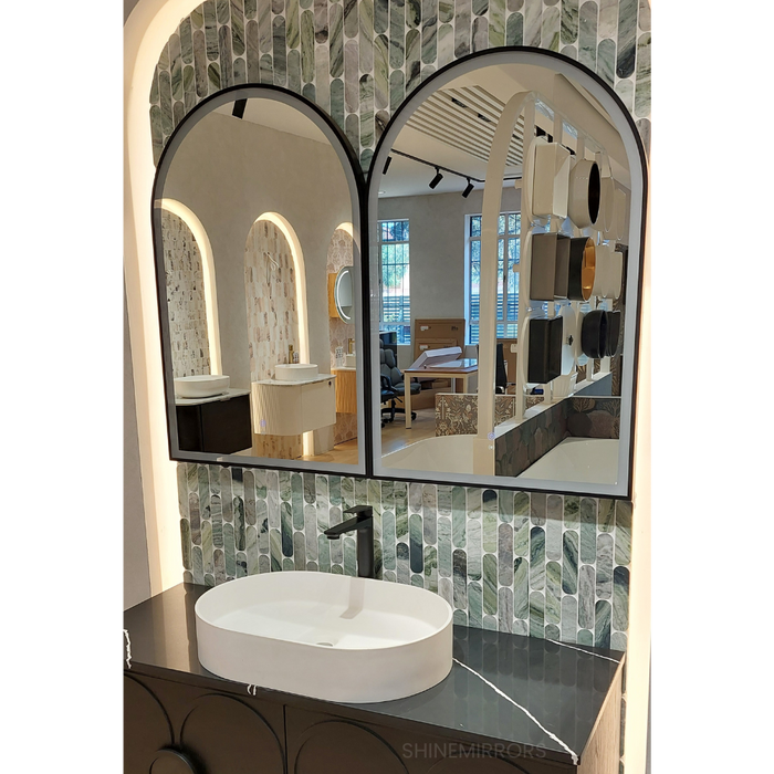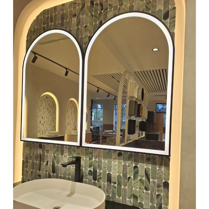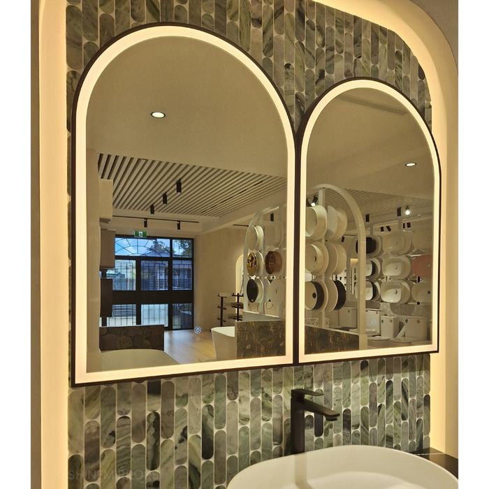 The Amalia Matte Black Arched LED Frontlit Wall Mirror features a dimmable LED light strip set behind an arched, anti-fog 5mm copper-free mirror. Enjoy optimal lighting and the absence of foggy reflection in this sleek and modern mirror.