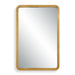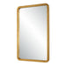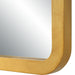 This wall mirror features curved corners that seamlessly blend into the sleek frame, resulting in a contemporary and elegant silhouette. The gold leaf finish reflects natural light, producing a cozy and welcoming radiance that can enhance the dimension and aesthetics of any space.