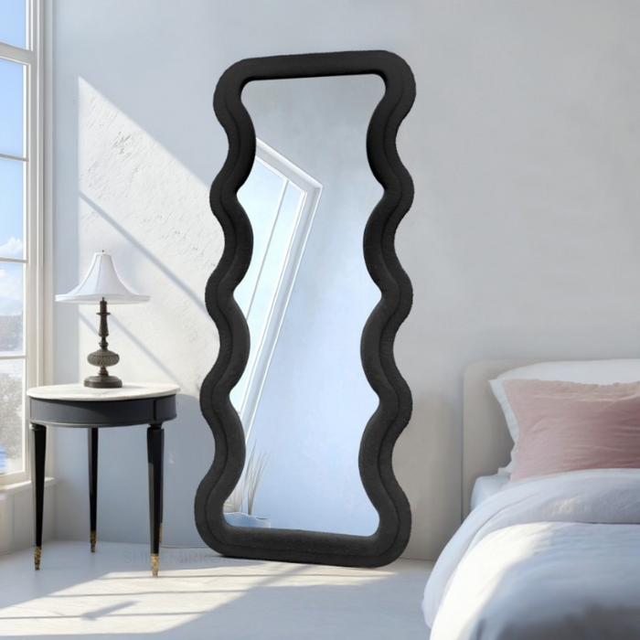 The Cedric Black Velvet Wave Full Length Mirror combines a luxurious black velvet frame with a distinctive wavy design, adding a sophisticated and contemporary touch to any space. Measuring 160cm by 60cm, it offers ample viewing area for outfit checks and enhances room openness. The 4mm HD silver mirror delivers sharp, true-to-life reflections with minimal distortion, while the sturdy 3mm MDF back panel ensures lasting durability. Designed for easy and secure vertical wall mounting, this mirror is both functional and stylish for expert interior settings.