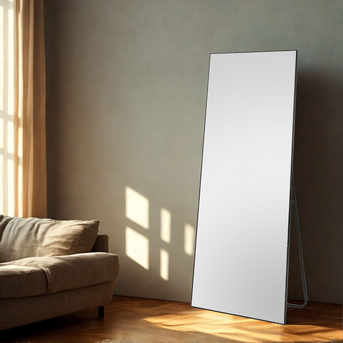 Designed with a slim black aluminium frame and a minimalist aesthetic, this full-length mirror can be hung on the wall, as it has keyholes behind the frame. It also includes a robust back stand, offering a stylish and functional freestanding solution ideal for walk-in wardrobes, bedrooms, or hallways.