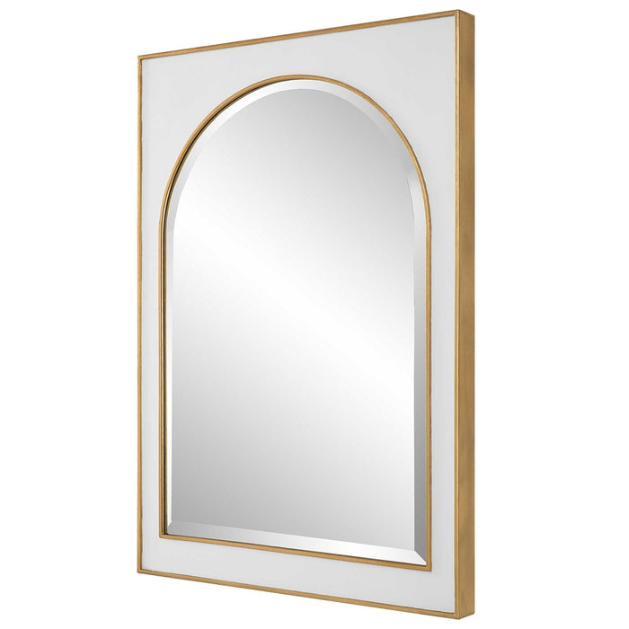 This Uttermost Crisanta Arch Gold Wall Mirror is ideal for any entryway or wall in need of an elegant touch. Crafted out of iron with a beautiful arch and raised edges finished in lightly antiqued gold leaf, this mirror features a 2.5cm bevel mirror and a glossy white finish for a luxurious look.