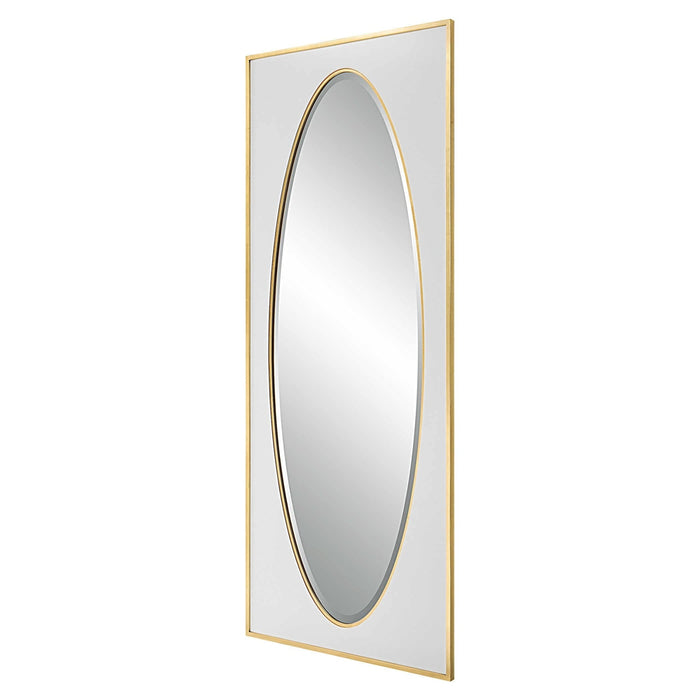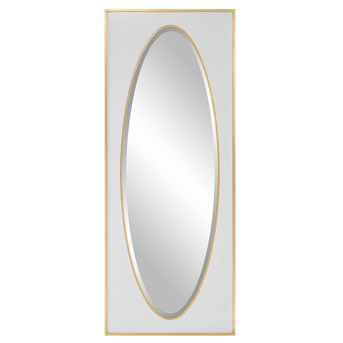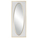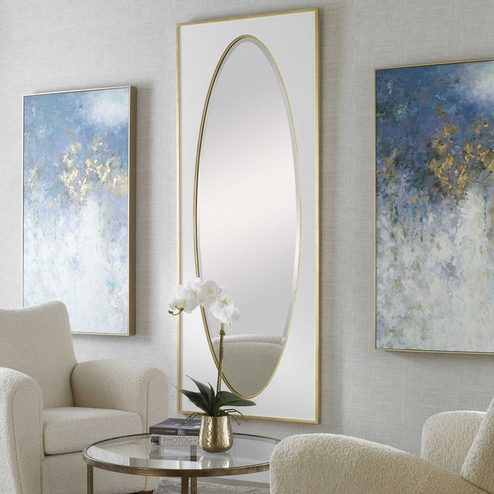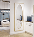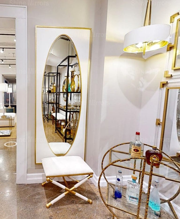 This is a sophisticated and elegant gold oval wall mirror with classic white and gold leaf palette. It is a timeless piece that will give an elevated touch to any room. The full length of 203cm maximises the high ceiling aspect of your interior.