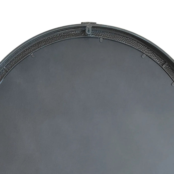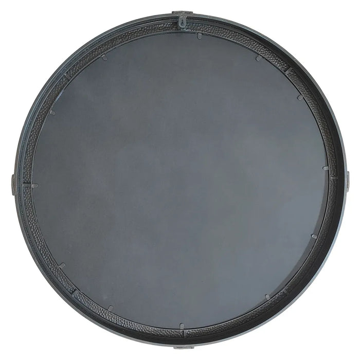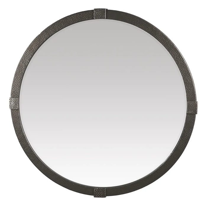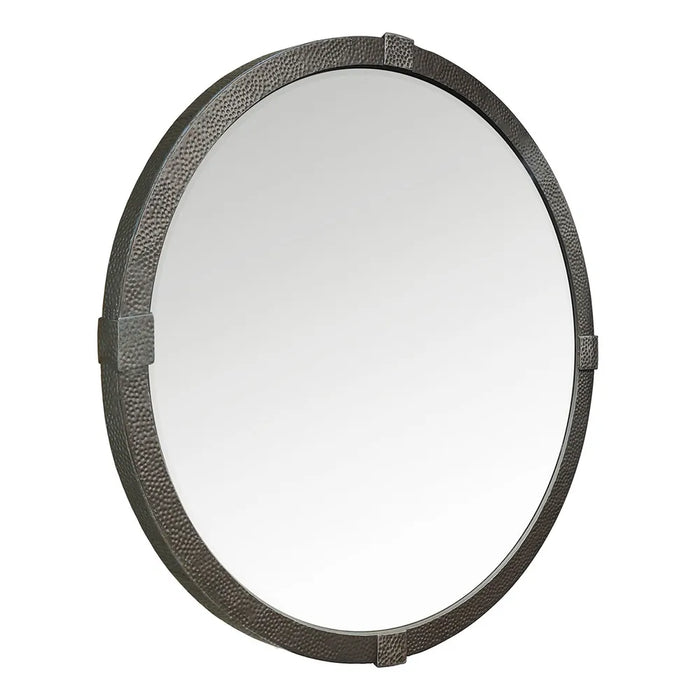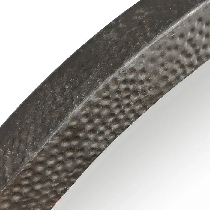 The Dennis Round Bronze Wall Mirror combines precision craftsmanship with elegant simplicity. Its perfectly circular form creates a focal point that enhances spatial perception while the meticulously finished frame adds a subtle artisanal touch. Featuring a handcrafted iron frame in a rich bronze finish, the hammered style frame gives an industrial look. This versatile piece complements both contemporary and traditional interiors, reflecting light strategically to brighten your space with sophisticated charm.