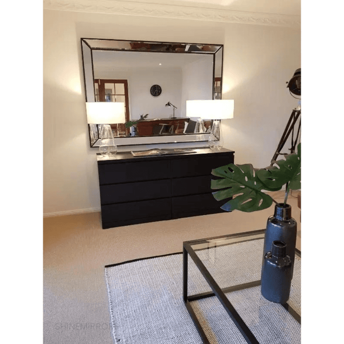 - 110cm x 140cm (whole mirror) with an 86cm x 116cm centre mirror (18kg weight)