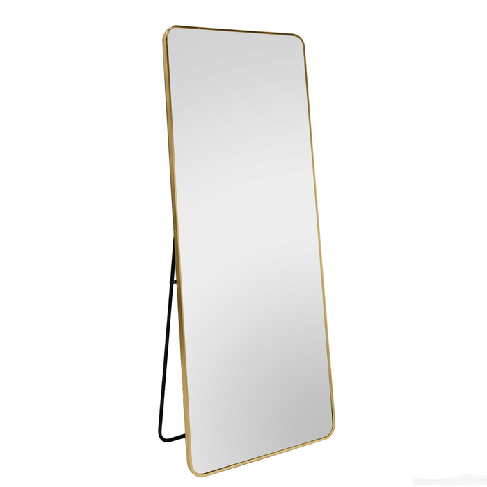 The Gelli Gold Full Length Freestanding Mirror features a sleek, slim-profile frame with curved corners that adds a touch of elegance to any space. Its refined design complements modern interiors while providing a clear, full-length reflection. Perfect for dressing rooms or bedrooms, this mirror combines style and functionality seamlessly.