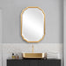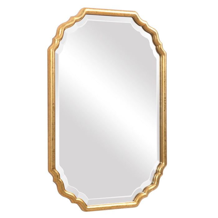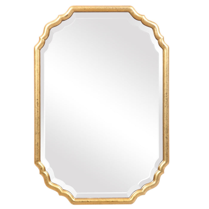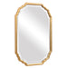 Lovely wall mirror with elegant curved corners and finished in a lightly antiqued, metallic gold leaf. The mirror also features a generous 3cm beveled centre mirror that helps to reflect light and create the illusion of a larger space.