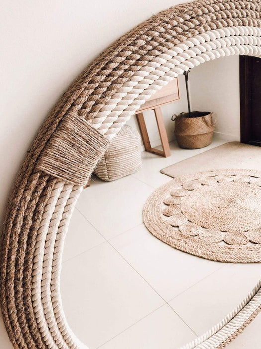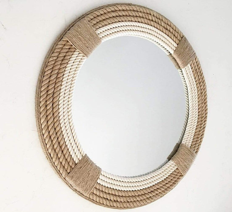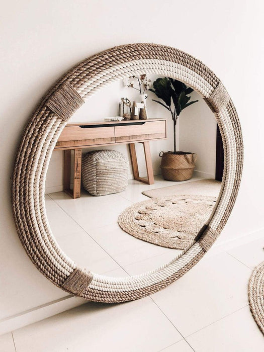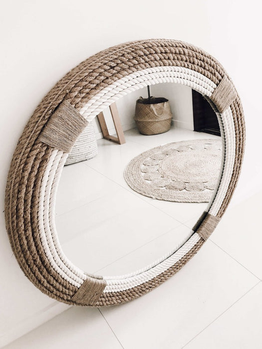Kobina Round Wall Mirror is made of twisted natural jute rope and white rope to make a stunning frame, perfect for a coastal themed interior. Showcasing a 6 layers of handcrafted twisted rope, this mirror will surely impress. Round shaped mirrors always feature a timeless beauty that stands out anywhere you place it.