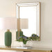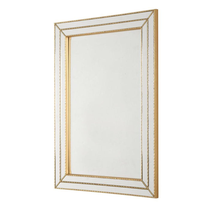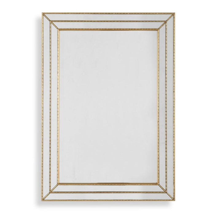 This elegant wall mirror showcases a stunning frame design with mirrored inlays and delicate, grooved framing strips. Its metallic gold finish with light antiquing gives added charm, while the center mirror is beautifully beveled at 2.5cm.