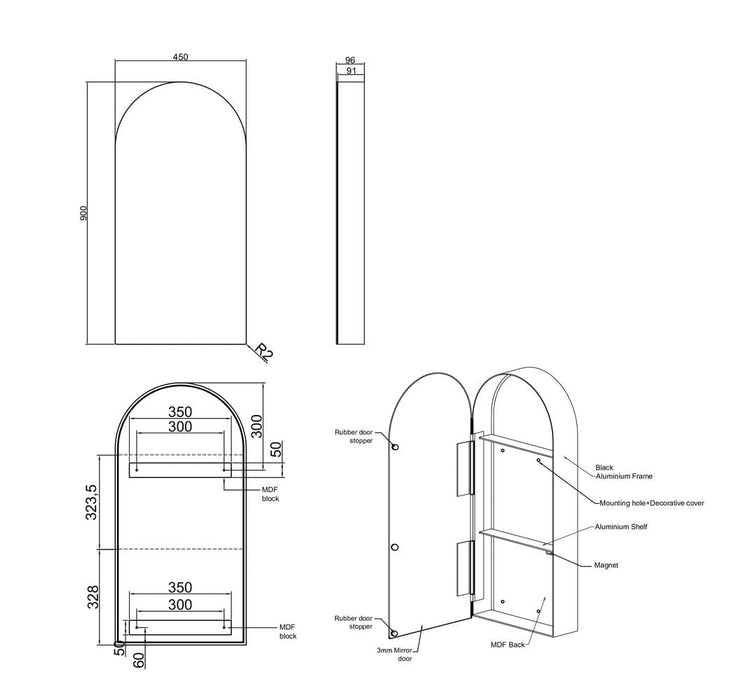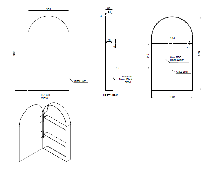 Upgrade your bathroom with the sleek Noemi Black Arch Shaving Cabinet. Featuring durable aluminium construction and a MDF backing, this cabinet is designed to last. With two adjustable glass shelves, you can easily organise and store your bathroom essentials.