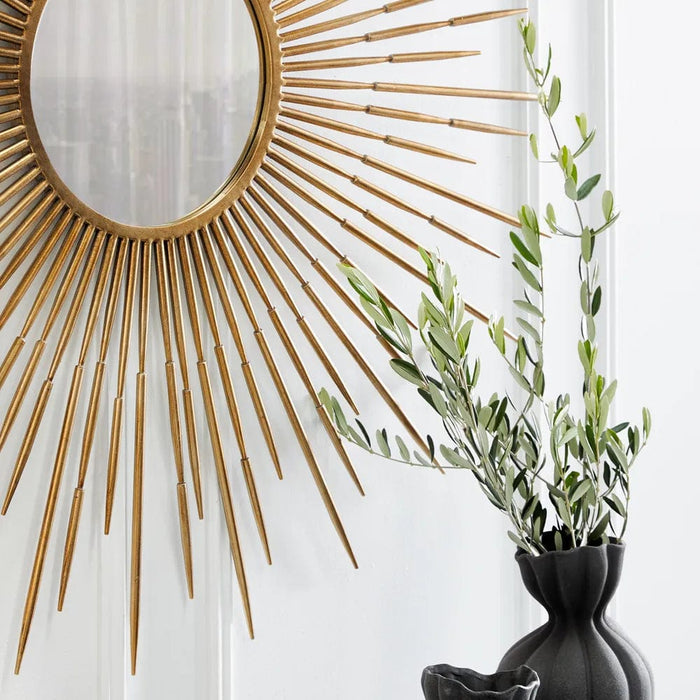 Enhance the elegance of your living space with our Normita Wall Mirror. The sunburst design and antique gold finish add a touch of sophistication to any room. Crafted with precision, this mirror boasts exquisite details that will elevate the overall aesthetic.