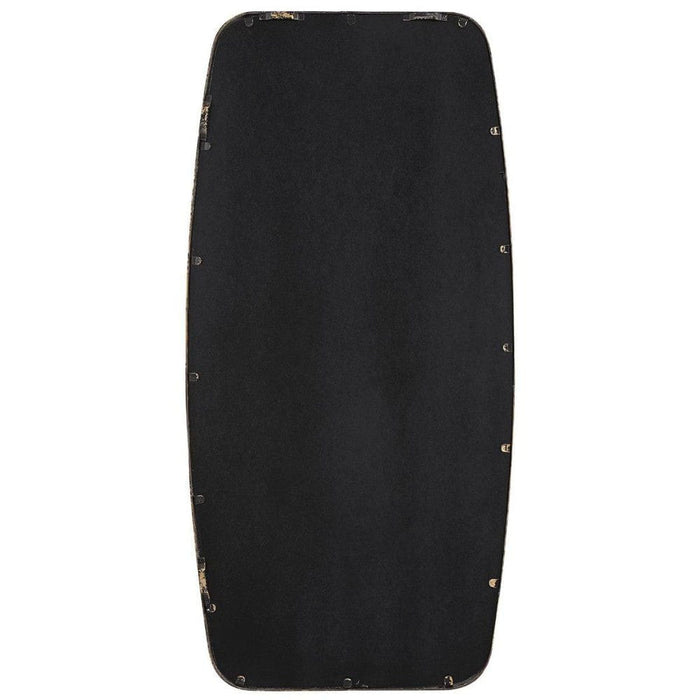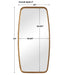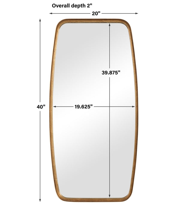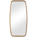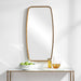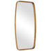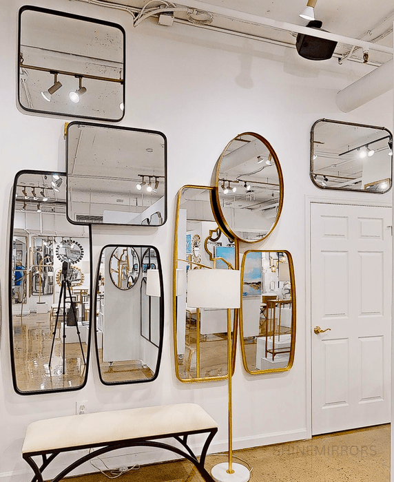 One of a kind wall mirror with a thick metal band with rounded corners and a thin inner tubing around the mirror. Its frame is finished in a gold leaf colour to make it more glamorous. Place it in the living room, dining room, or hallway. Can be hung either vertically or horizontally.