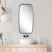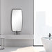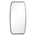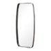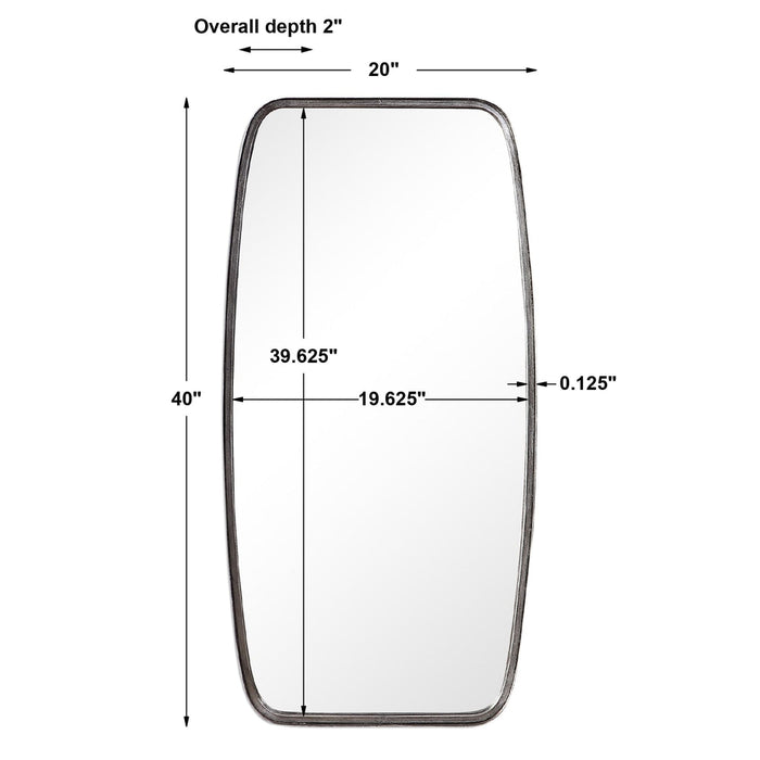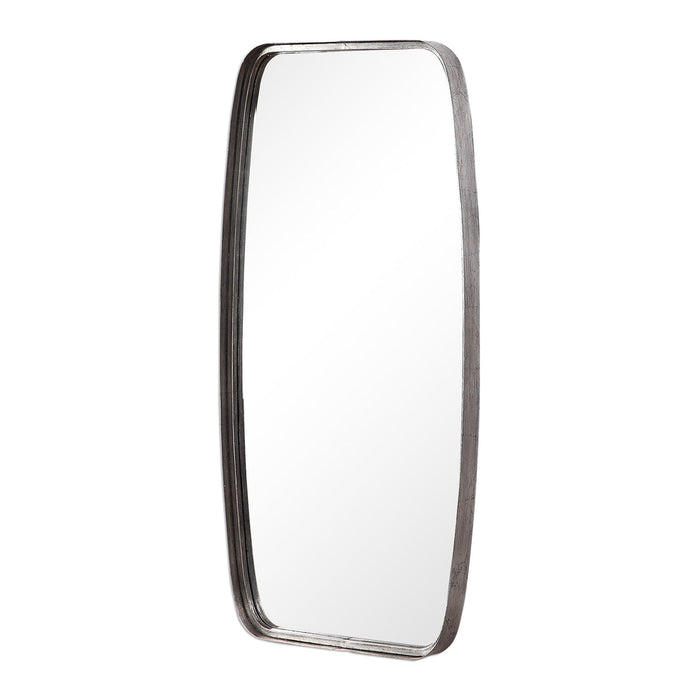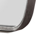 Modern minimalist style wall mirror featuring a thick metal band with rounded corners and a thin inner tubing around the mirror. The frame has an antique silver leaf. Can be hung either vertically or horizontally.