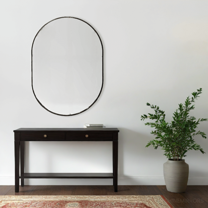 Elevate the aesthetics of any room with the Martin Oval Black Framed Wall Mirror. The sleek black finish accentuates the mirror's shape, creating a modern and elegant look. Add depth and dimension to your space while checking your reflection. Elevate your décor with this stunning mirror.