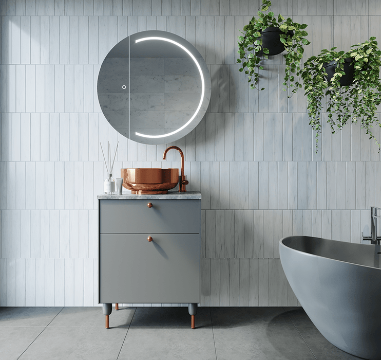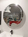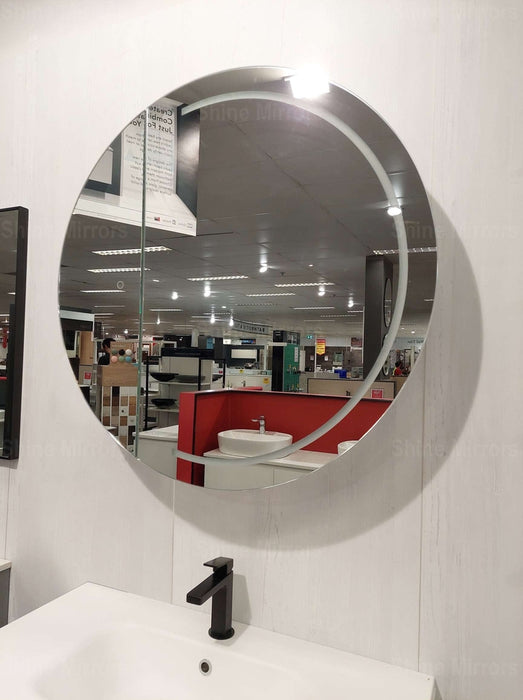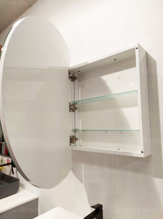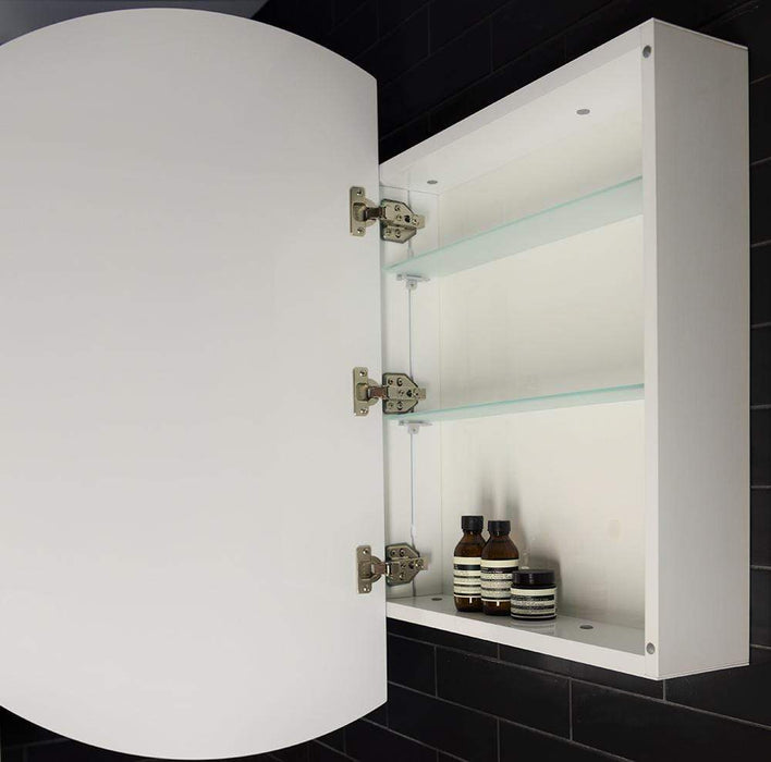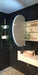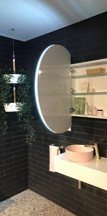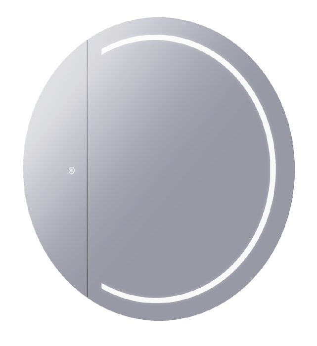 An LED Round Frontlit wall mirror cabinet for the powder room. Its LED Strip was designed as half-moon for a more modern feel. The cabinet door was placed on the left side in contemporary design.