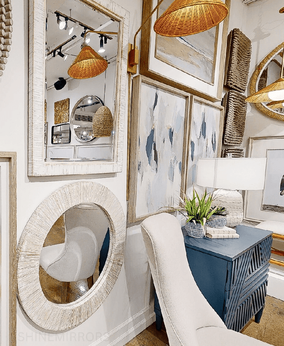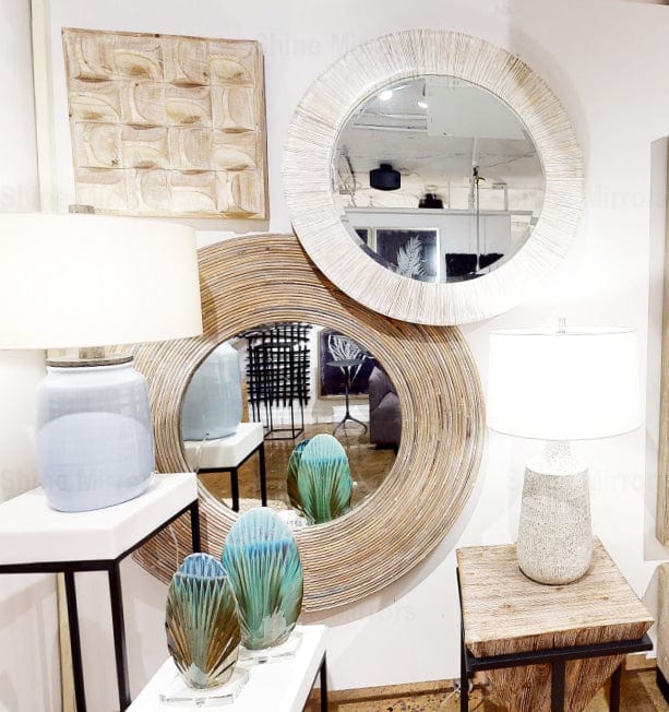 This Vintage style round wall mirror will give out a relaxing vibe to your room. It has a frame made from natural bamboo with heavily rubbed whitewash finish. The centre mirror comes with a 3.8cm bevel