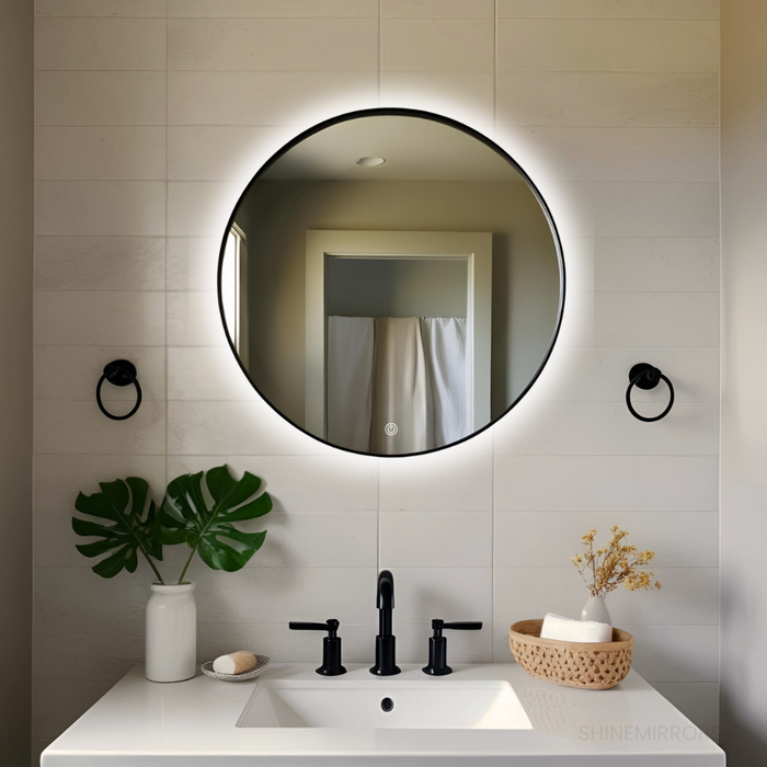 The Roxy Round Black Framed Backlit LED Bathroom Mirror boasts a sleek black bevel frame and halo lighting, providing a modern and functional addition to any bathroom. The frame adds a touch of sophistication, while the halo lighting provides even illumination for a clear and reflective view. Upgrade your bathroom with this stylish and practical mirror.