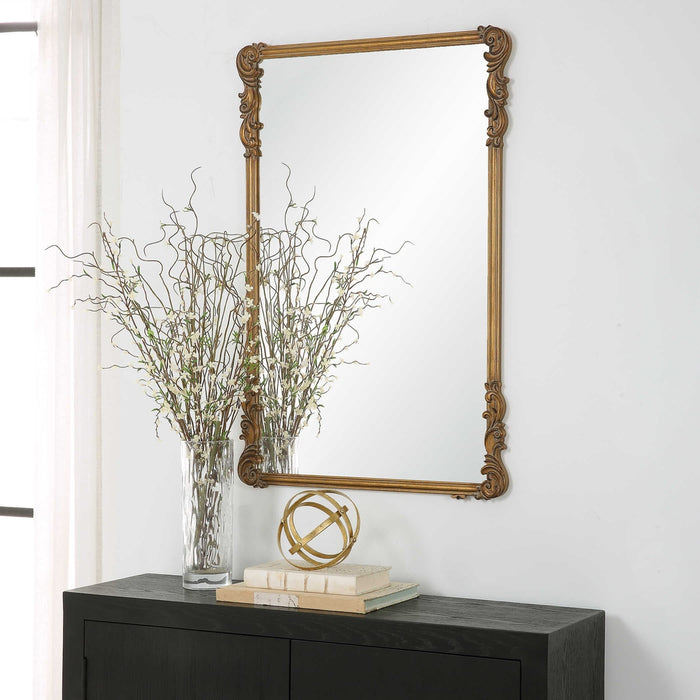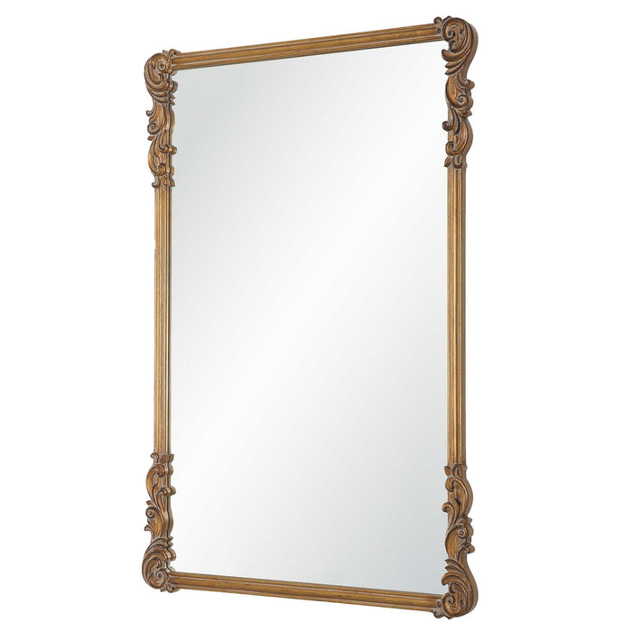 Create an eye-catching design in any space in your home with this ornate mirror. Its beautiful frame is finished in antique gold which would make any wall look better.