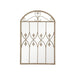 The Shaina Vintage Iron Windowpane Outdoor Wall Mirror features a distressed antique brown metal frame with elegant fleur-de-lis accents and arched latticework, inspired by classic European architecture. This expertly crafted piece combines vintage charm with architectural detail, making it a sophisticated focal point that enhances any interior with timeless style and refined character.