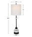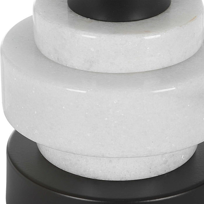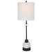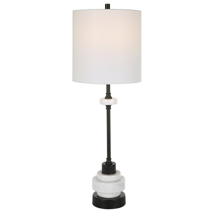 Introducing Uttermost's Alliance Traditional Buffet Lamp, crafted with stacked white marble disk and satin black iron details for a traditional look. The petite drum shade, covered in white linen fabric, adds a subtle yet elegant touch. Perfect for any room in your home.