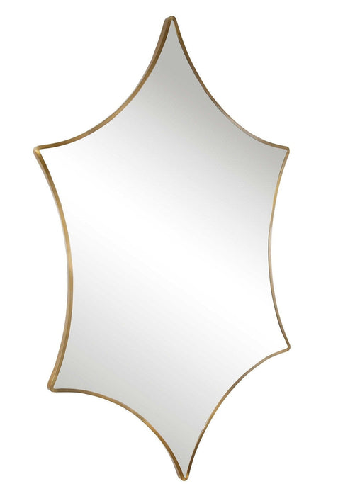 This uniquely shape mirror offers a modern simplistic look that adds beauty to the interior. A stainless frame with gracefully curved points was finished in a classic brushed gold colour. May be hung either horizontally or vertically to maximise a space or to work in any way according to your wall space. Uttermost Aries Wall Mirror is perfect for an entryway or a stunning over the sofa display showing off its distinctive features.