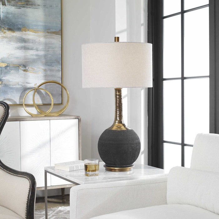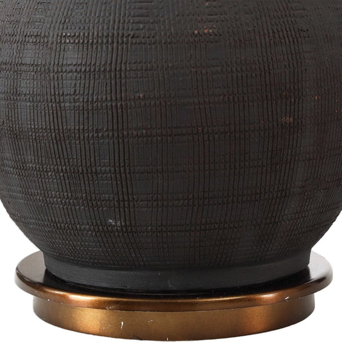 Enhance your living space with the Uttermost Arnav Textured Black Lamp. Featuring a textured, matte black hand-scored ceramic base, a metallic golden bronze glazed neck, and a round hardback drum shade in light gray linen fabric, this lamp exudes sophistication wherever it is placed.