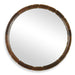 The round wall mirror showcases a striking design with a segmented metal frame and cutouts, evoking a soft industrial aesthetic. It is enhanced with an aged rust bronze finish for a unique touch.