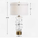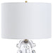 The Uttermost Aura Table Lamp combines elegance and modern design with a clear glass base featuring organic glass spheres, resting on a plated brushed brass foot. Its crisp white linen round drum hardback shade provides a clean, sophisticated glow, making it an ideal choice to enhance any interior with a refined and timeless appeal.