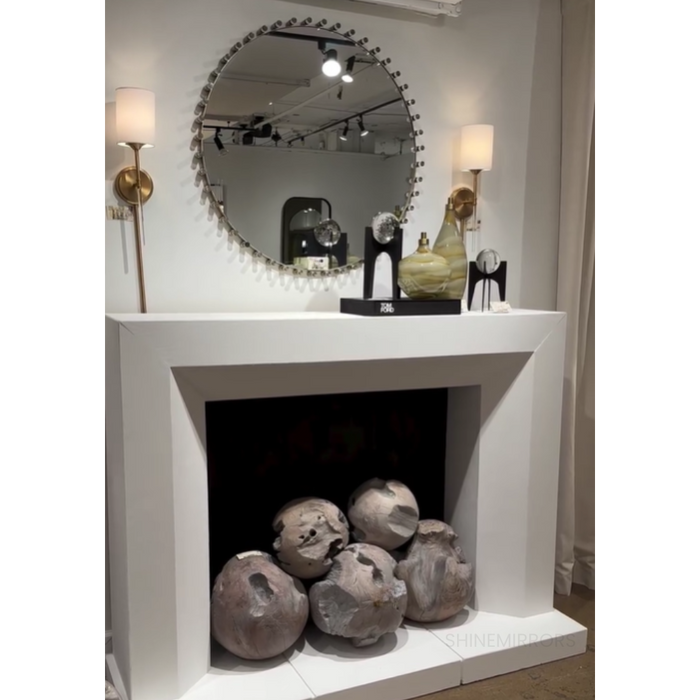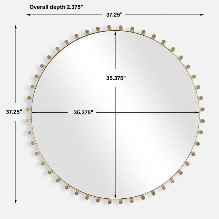The Uttermost Avelyne Antique Brass Round Wall Mirror seamlessly combines sophistication and contemporary style, incorporating a plated antique brass outer frame encircled by thick acrylic rods.