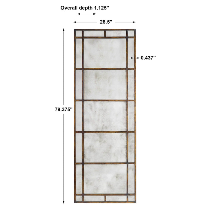 The Uttermost Avidan Large Wall Mirror emits an authentic rustic vibe. This imposing and luxurious piece stands tall with its narrow metal frame, which is given a rustic bronze finish and houses antique-styled mirrors to complete an aged look.