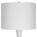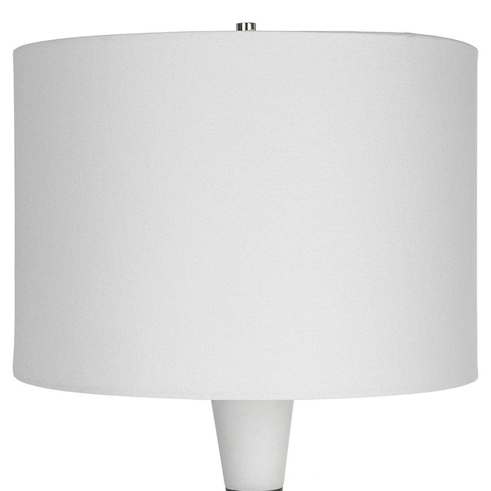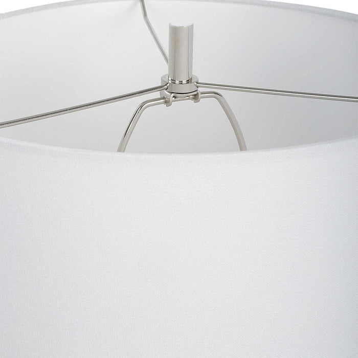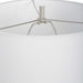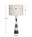 The Uttermost Bandeau Banded Stone Table Lamp adds a touch of sophistication to any room. Crafted from a unique banded black and white man-made stone, its hourglass shape accurately replicates the look of Thassos marble. Finished with polished nickel iron details and a white linen fabric drum shade, it's sure to elevate your décor.